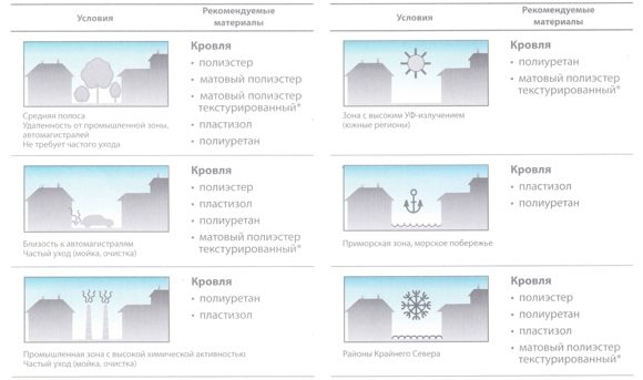 На российском рынке представлено большое количество кровельных материалов на любой вкус и доход: металлочерепица, кровельный профнастил, фальцевая кровля, еврошифер, гибкая черепица, цементно-песчаная черепица и пр. При выборе того или иного материала следует учитывать не только стоимость материала и монтажа, но и расходы на доборные элементы, обрешетку, стропильную конструкцию, послемонтажный ежегодный уход, ремонтопригодность. Так, например, под гибкую черепицу необходимо выполнять сплошную обрешетку из влагостойкой фанеры, цементно-песчаную черепицу следует закладывать еще при проектировании в связи с большим весом материала и нагрузкой на стропильную систему. Следует также уделить внимание долговечности кровельного материала, стойкости к воздействию различных факторов: уфизлучению, морозостойкости, к внешнему физическому воздействию и пр.