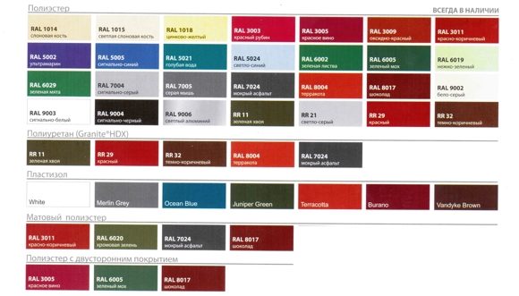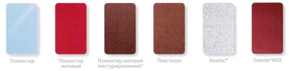 Aluzinc (алюцинк) | PE (полиэстер) | Velur (велюр) | Granite HDX (пурал) | Solano 30 (солано) | Wood (вуд) | ||||